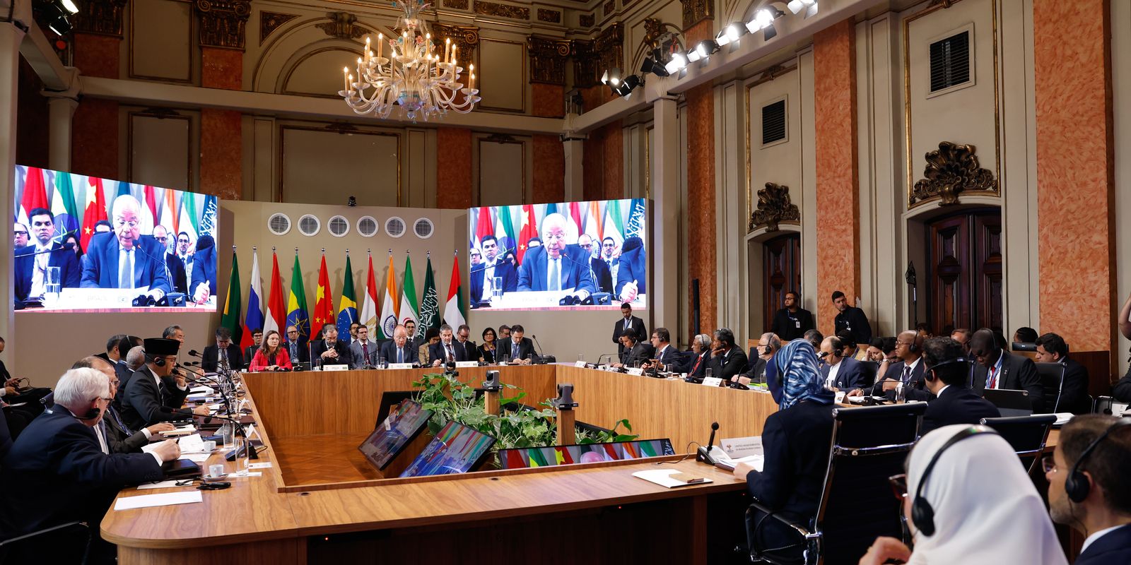 As delegações chegaram por volta das 10h30 e fizeram a foto oficial. Agora acontece a primeira sessão do encontro, presidida pelo ministro das Relações Exteriores, Mauro Vieira. Essa sessão debate o papel dos Brics na abordagem de crises globais e regionais e no avanço dos caminhos para a paz e a segurança.