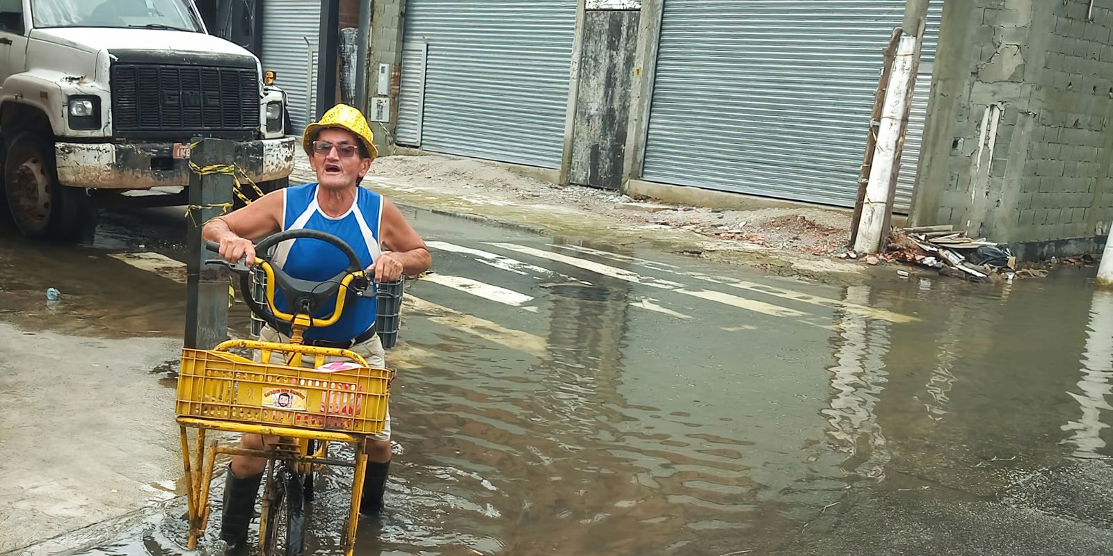 “Faltaram dez casas para chegar [a água]”, diz ele, que se locomove de bicicleta para fechar as vendas e, com a enchente, tem que desviar de ruas e pedalar por maiores distâncias.